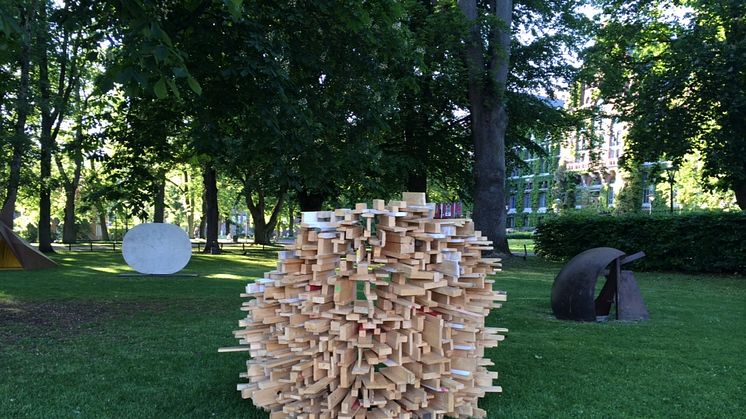 Tio olika verk av återvunnet karnevalsmaterial. Det skapade Arkitektskolans elever under en workshop som Lunds kommun och Arkitektskolan i Lund anordnade under namnet PopUpSolbjer i slutet av maj.
