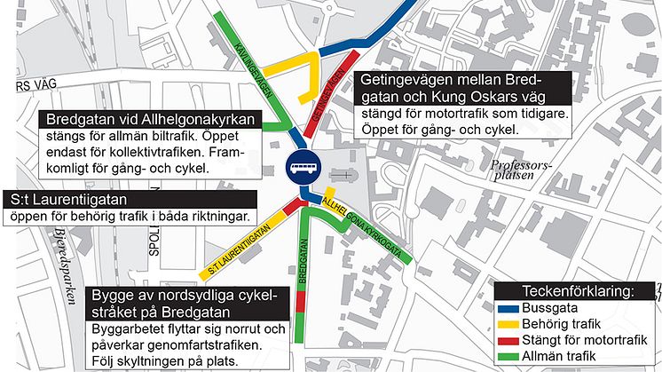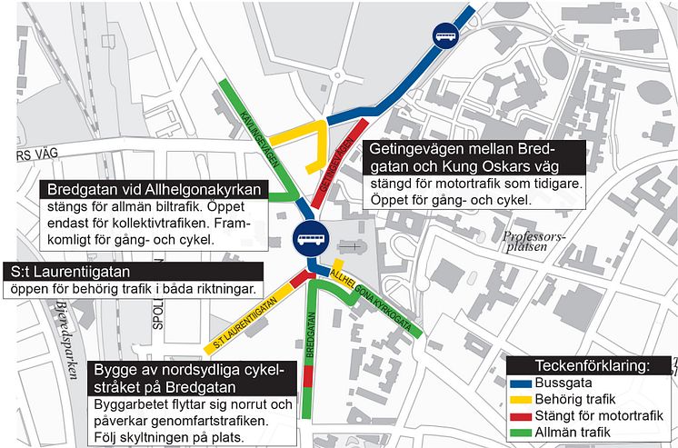 Allmän trafik hänvisas till Bredgatan - Norra Vallgatan - Allhelgona kyrkogata. Tänk dock på att det samtidigt pågår ett annat byggarbete på Bredgatan, söder om korsningen vid Allhelgonakyrkan. Där byggs det Nordsydliga cykelstråket. Bygget sker från fasad till fasad och påverkar genomfartstrafiken.