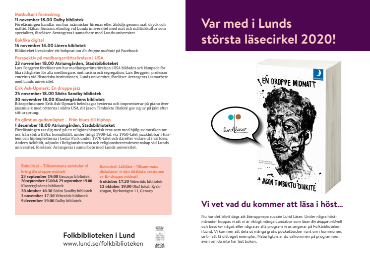 Ikväll, vid en ceremoni på Stadsbiblioteket i Lund, avslöjades det vilken som blir årets bok. Det blir ”En droppe midnatt” av artisten och lundasonen Jason Timbuktu Diakité som blir föremål för höstens stora publika bokcirkel.