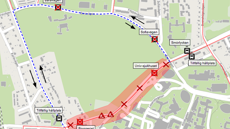 Linje 2, 4, 6, 20, Ske2, Ske5, 108, 126, 137, 139, 159, 160, 165 166, 169 får tillfällig hållplats Smörlyckan istället för Universitetssjukhuset. Linje 126, 137, 139 och 165 får i riktning mot Universitetssjukhuset (ändhållplats) Sofiavägen som hållplats.