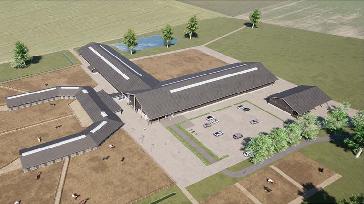 I det öppna slättlandskapet på Ladumarken i norra Lund planeras den nya ridanläggningen ta form. Här ska två ridhus med ridbanor, en administrativ del och ett kafé, ett hästskoformat stall med utsläpp till hage direkt från boxarna, utomhusbanor och rasthagar byggas.