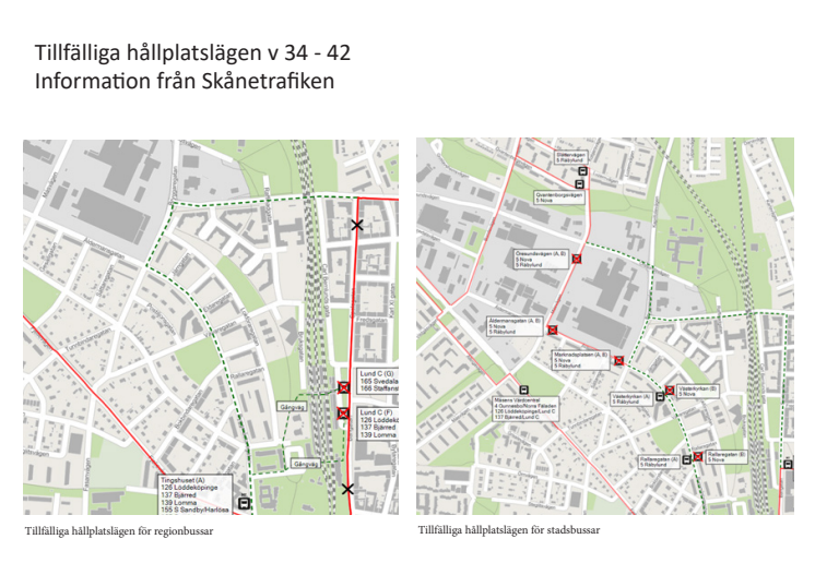 - Busstrafik västerut på Trollebergsvägen leds om via Kung Oskars väg och närmaste hållplatser för stadsbussar och regionbussar blir på Clemenstorget läge L utanför Malmborgs respektive hållplats Tingshuset för att komma till Lund C. Byte från stadsbuss till regionbuss blir inte möjligt på Lund C. Byten från stadsbuss till regionbuss sker i stället enligt: Linje 2: stig av vid hållplats Västertull och gå till hållplats Tingshuset. Linje 4: stig av vid hållplats Polishuset och gå till hållplats Tingshuset. Linje 5: stig av vid Lund C och gå under järnvägen till hållplats Tingshuset. (Se kartor i bifogad fil).