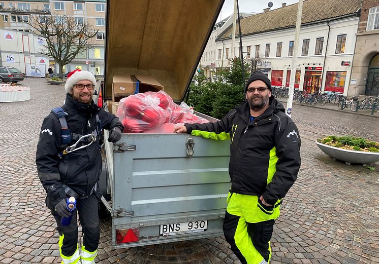 2 Ett släp kommer lastat med riktigt stora julkulor. Magnus Hellberg och Andreas Maganja från KL-gruppen i Lunds kommun står redo att pynta granen på Stortorget inför grantändningen på fredag.
