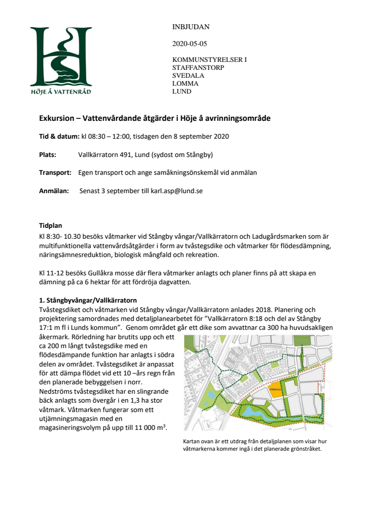 Höje å Vattenråd bjuder in kommunstyrelserna i sina fyra medlemskommuner tillsammans med media till en exkursion i Höje å avrinningsområde tisdag den 8 september.
