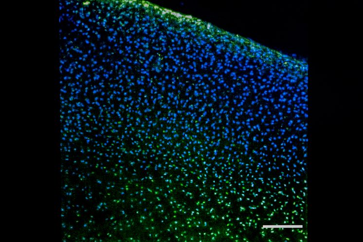 Broskvävnad med gröna nanopartiklar och blåa signaler från kondrocyter
