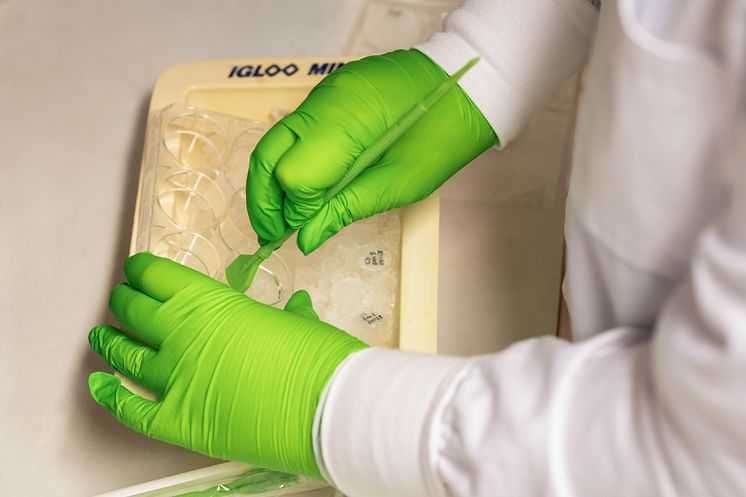 Doktorand Alva Johansson skördar humana mesangieceller i cellodlingslaboratoriet. Mesangieceller är en av cellytperna som finns i njurens filtrationsenheter och deras funktion påverkas kraftigt vid bland annat sjukdomen IgA nefrit.