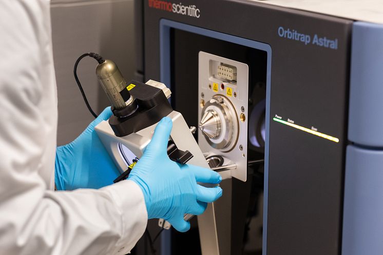 Ingången och jonkällan till det nya masspektrometersystemet som kommer kopplas och köras med nano- eller micro- vätskekromatografi separation.