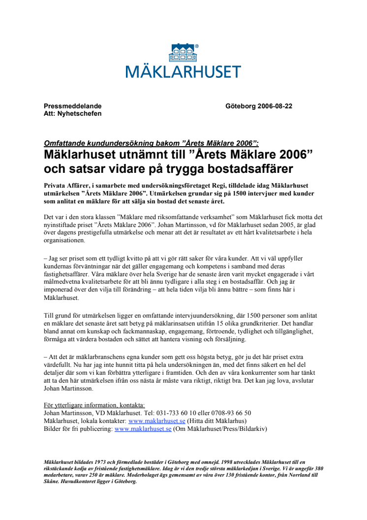 Privata Affärer, i samarbete med undersökningsföretaget Regi, tilldelade idag Mäklarhuset utmärkelsen ”Årets Mäklare 2006”. Utmärkelsen grundar sig på 1500 intervjuer med kunder som anlitat en mäklare för att sälja sin bostad det senaste året.