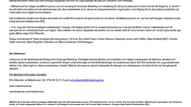 Mäklarhusets vd Erik Wikander har som en av åtta personer i Sverige nominerats till utmärkelsen ”Årets Employer Branding-person” av undersökningsföretaget Universum. Vinnaren utses vid Universum Awards 2014 i början av mars nästa år. – Det känns väldigt roligt och hedrande att nomineras till den här utmärkelsen och ett erkännande av vårt målmedvetna arbete med att stärka Mäklarhusets erbjudande och position som en attraktiv arbetsgivare, säger Erik Wikander.