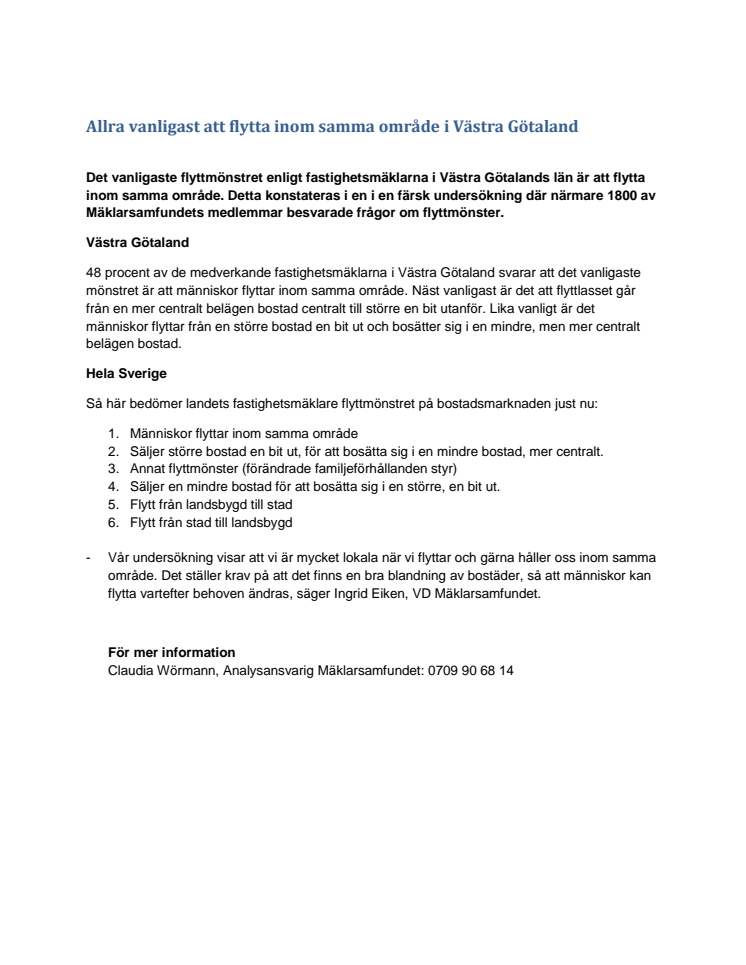 Det vanligaste flyttmönstret enligt fastighetsmäklarna i Västra Götalands län är att flytta inom samma område. Detta konstateras i en i en färsk undersökning där närmare 1800 av Mäklarsamfundets medlemmar besvarade frågor om flyttmönster.
