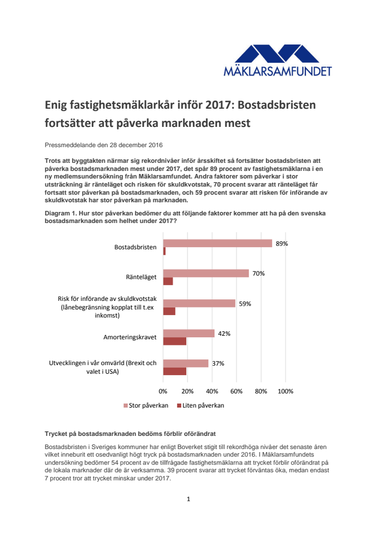 Enig fastighetsmäklarkår inför 2017: Bostadsbristen fortsätter att påverka marknaden mest