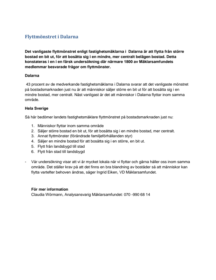 Det vanligaste flyttmönstret enligt fastighetsmäklarna i Dalarna är att flytta från större bostad en bit ut, för att bosätta sig i en mindre, mer centralt belägen bostad. Detta konstateras i en i en färsk undersökning där närmare 1800 av Mäklarsamfundets medlemmar besvarade frågor om flyttmönster.