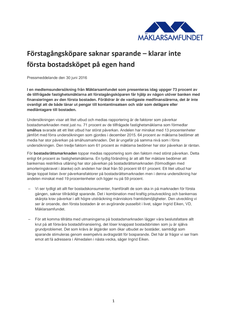 I en medlemsundersökning från Mäklarsamfundet som presenteras idag uppger 73 procent av de tillfrågade fastighetsmäklarna att förstagångsköparen får hjälp av någon utöver banken med finansieringen av den första bostaden. Föräldrar är de vanligaste medfinansiärerna, det är inte ovanligt att de både lånar ut pengar till kontantinsatsen och står som delägare eller medlåntagare till bostaden.