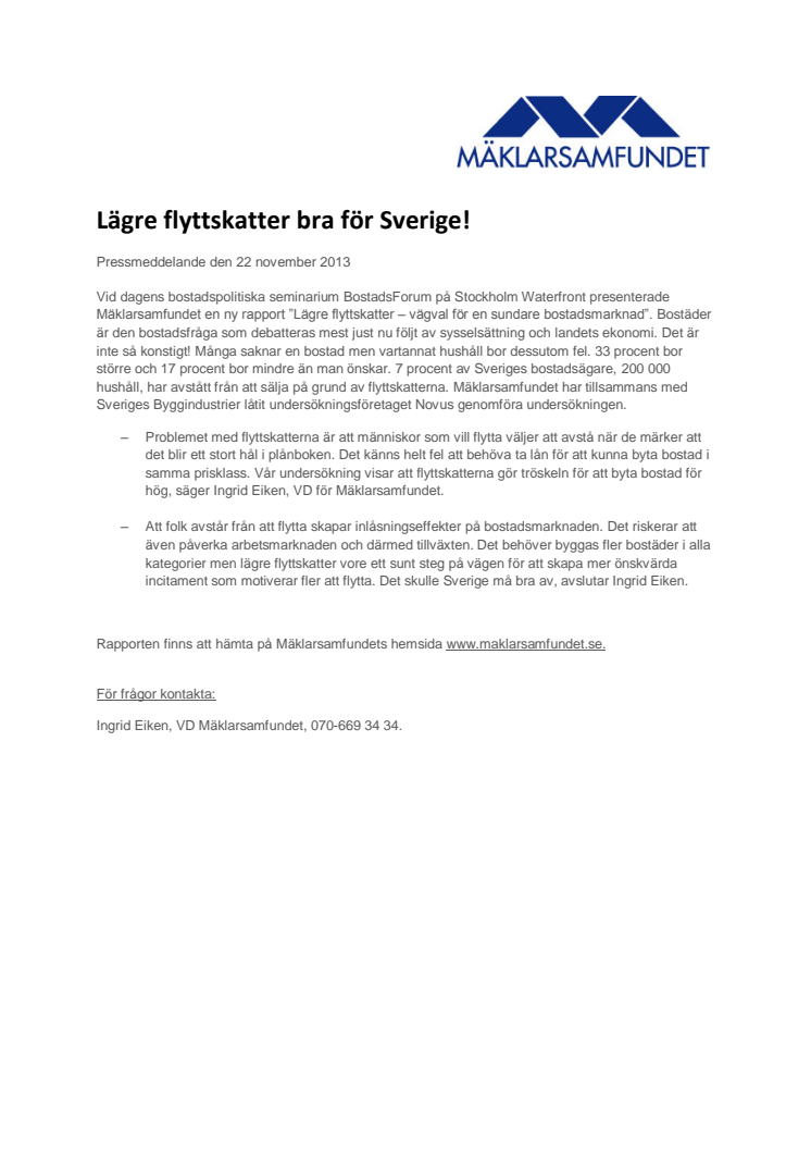 Vid dagens bostadspolitiska seminarium BostadsForum på Stockholm Waterfront presenterade Mäklarsamfundet en ny rapport ”Lägre flyttskatter – vägval för en sundare bostadsmarknad”. Bostäder är den bostadsfråga som debatteras mest just nu följt av sysselsättning och landets ekonomi. Det är inte så konstigt! Många saknar en bostad men vartannat hushåll bor dessutom fel.