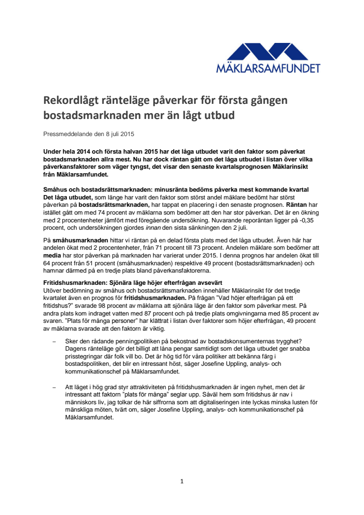 Under hela 2014 och första halvan 2015 har det låga utbudet varit den faktor som påverkat bostadsmarknaden allra mest. Nu har dock räntan gått om det låga utbudet i listan över vilka påverkansfaktorer som väger tyngst, det visar den senaste kvartalsprognosen Mäklarinsikt från Mäklarsamfundet.