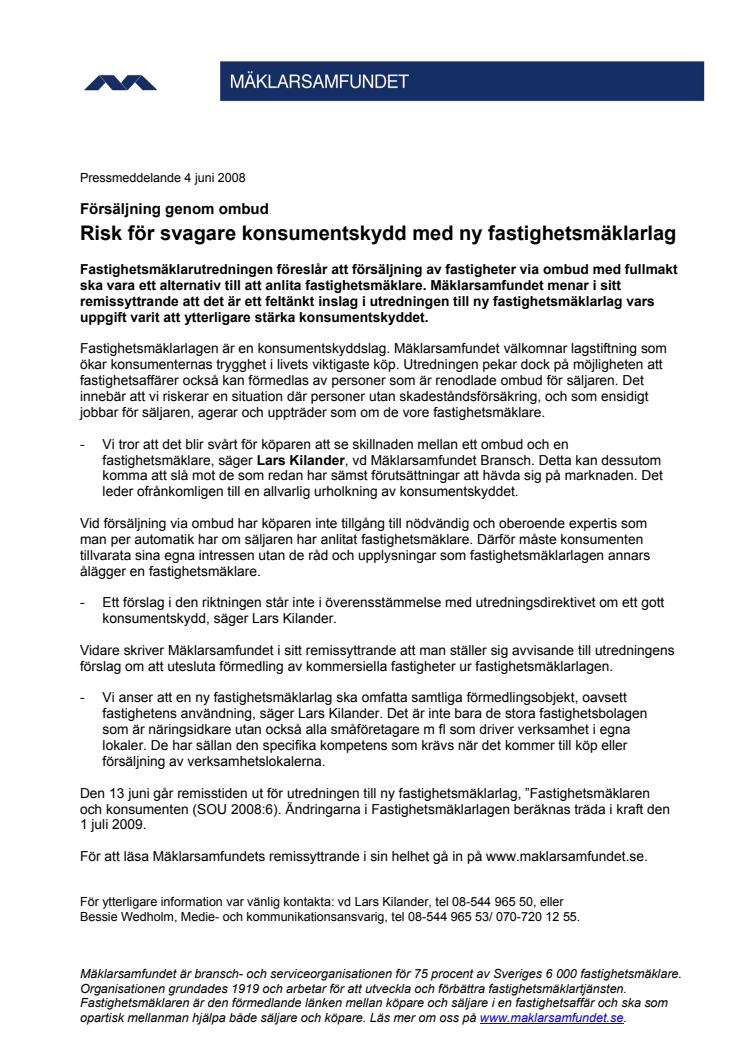 Fastighetsmäklarutredningen föreslår att försäljning av fastigheter via ombud med fullmakt ska vara ett alternativ till att anlita fastighetsmäklare. Mäklarsamfundet menar i sitt remissyttrande att det är ett feltänkt inslag i utredningen till ny fastighetsmäklarlag vars uppgift varit att ytterligare stärka konsumentskyddet.