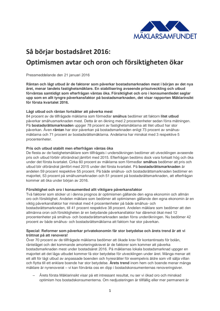 Så börjar bostadsåret 2016: Optimismen avtar och oron och försiktigheten ökar