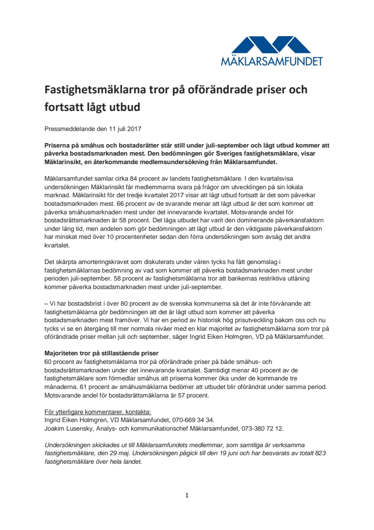 – Vi har bostadsbrist i över 80 procent av de svenska kommunerna så det är inte förvånande att fastighetsmäklarna gör bedömningen att det är lågt utbud som kommer att påverka bostadsmarknaden mest framöver. Vi har en period av historisk hög prisutveckling bakom oss och nu tycks vi se en återgång till mer normala nivåer med en klar majoritet av fastighetsmäklarna som tror på oförändrade priser mellan juli och september, säger Ingrid Eiken Holmgren, VD på Mäklarsamfundet.