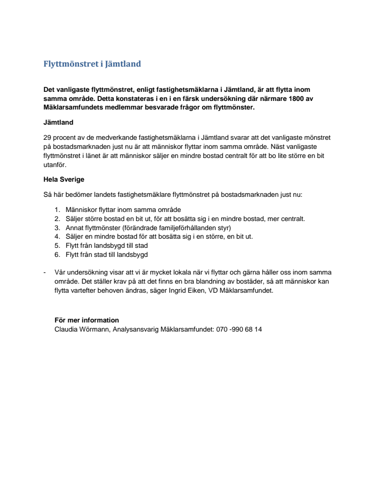 29 procent av de medverkande fastighetsmäklarna i Jämtland svarar att det vanligaste mönstret på bostadsmarknaden just nu är att människor flyttar inom samma område. Näst vanligaste flyttmönstret i länet är att människor säljer en mindre bostad centralt för att bo lite större en bit utanför.