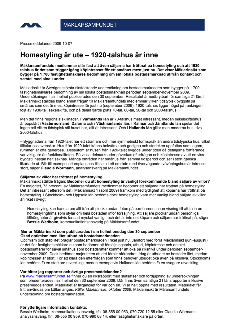 Bessie Wedholm, kommunikationsansvarig, tfn. 08-555 00953, 070-720 12 55 eller Claudia Wörmann, analysansvarig, tfn. 08-555 00959, 070-990 68 14, eller fastighetsmäklare på orten.