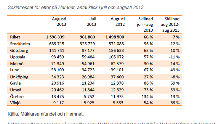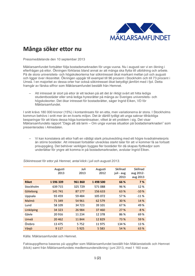 Mäklarsamfundet fortsätter följa bostadsmarknaden för unga vuxna. Nu i augusti ser vi en ökning i efterfrågan på ettor. Ökningen förklaras bland annat av att många ska flytta till utbildning och arbete. På de stora universitets- och högskoleorterna har sökintresset ökat markant mellan juli och augusti och ligger över rikssnittet. Ökningen uppgår till exempel till 96 procent i Stockholm och till 73 procent i Umeå. I en majoritet av dessa orter har också sökintresset ökat betydligt jämfört med i fjol. Detta framgår av färska siffror som Mäklarsamfundet beställt från Hemnet.