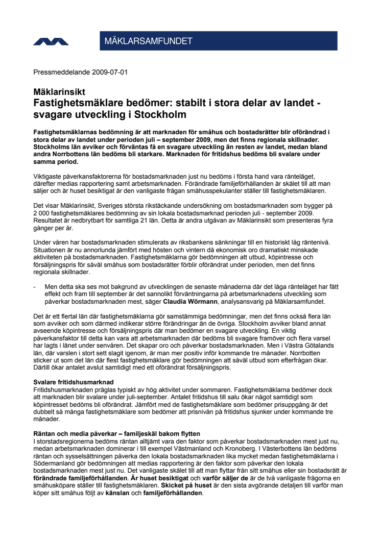 Fastighetsmäklarnas bedömning är att marknaden för småhus och bostadsrätter blir oförändrad i stora delar av landet under perioden juli - september 2009, men det finns regionala skillnader. Stockholms län avviker och förväntas få en svagare utveckling än resten av landet, medan bland andra Norrbottens län bedöms bli starkare. Marknaden för fritidshus bedöms bli svalare under samma period.