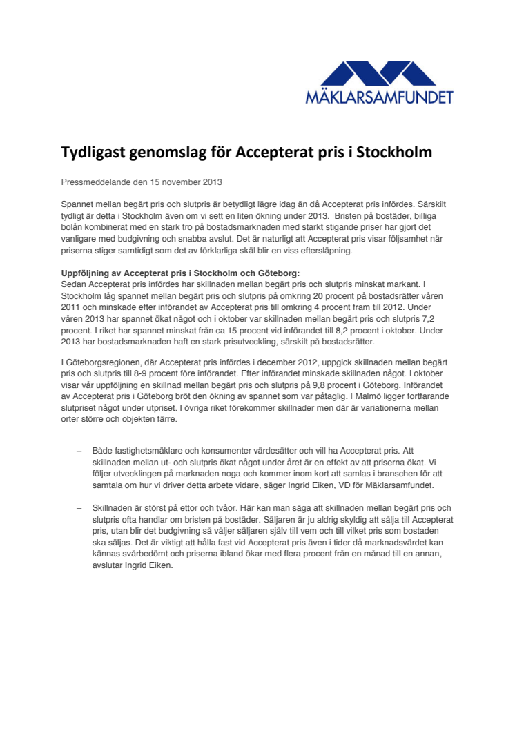 – Både fastighetsmäklare och konsumenter värdesätter och vill ha Accepterat pris. Att skillnaden mellan ut- och slutpris ökat något under året är en effekt av att priserna ökat. Vi följer utvecklingen på marknaden noga och kommer inom kort att samlas i branschen för att samtala om hur vi driver detta arbete vidare, säger Ingrid Eiken, VD för Mäklarsamfundet.
