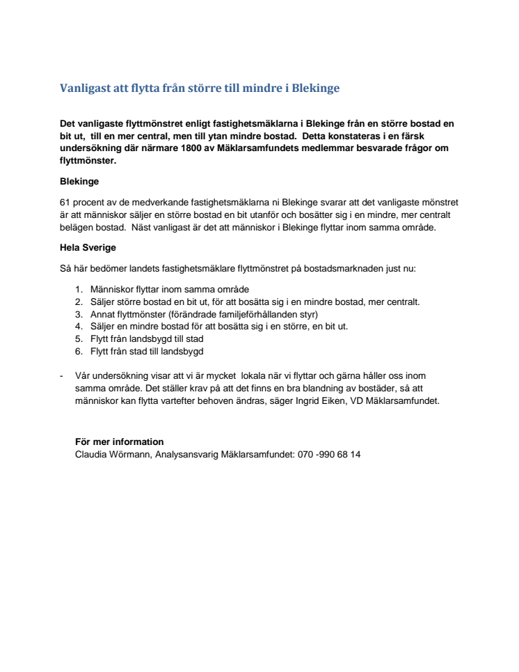 61 procent av de medverkande fastighetsmäklarna ni Blekinge svarar att det vanligaste mönstret är att människor säljer en större bostad en bit utanför och bosätter sig i en mindre, mer centralt belägen bostad. Näst vanligast är det att människor i Blekinge flyttar inom samma område.