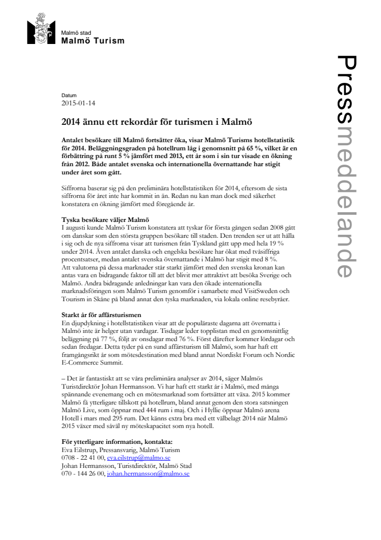Antalet besökare till Malmö fortsätter öka, visar Malmö Turisms hotellstatistik för 2014. Beläggningsgraden på hotellrum låg i genomsnitt på 65 %, vilket är en förbättring på runt 5 % jämfört med 2013, ett år som i sin tur visade en ökning från 2012.