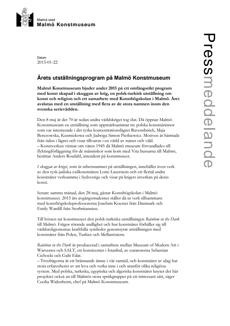 Malmö Konstmuseum bjuder under 2015 på ett omfångsrikt program med konst skapad i skuggan av krig, en polsk-turkisk utställning om konst och religion och ett samarbete med Konsthögskolan i Malmö. Året avslutas med en utställning med flera av de stora namnen inom den svenska serievärlden.