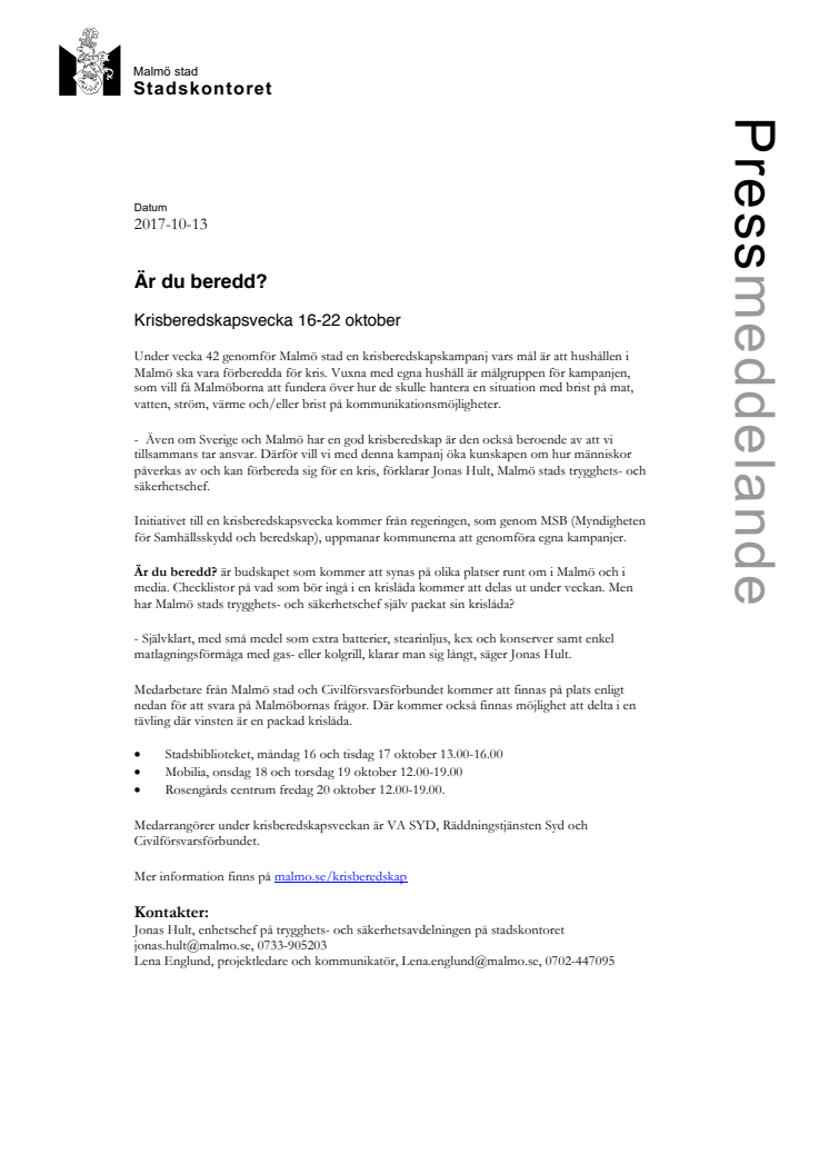 Är du beredd är budskapet den 16-22 oktober då Malmö stad genomför en krisberedskapsvecka för att informera Malmöborna om hur de kan rusta sig för kris. Checklistor på vad som kan utgöra en krislåda delas ut på mötesplatser där det också finns möjlighet att ställa frågor om allt inom området krisberedskap.