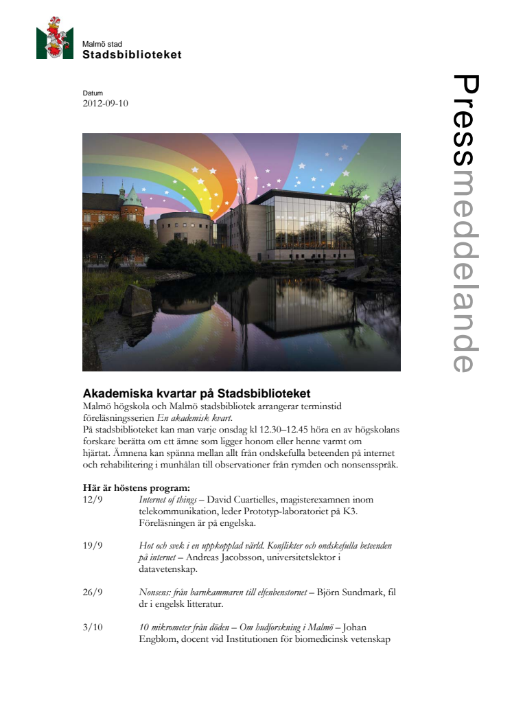 Akademiska kvartar på Stadsbiblioteket i Malmö i höst