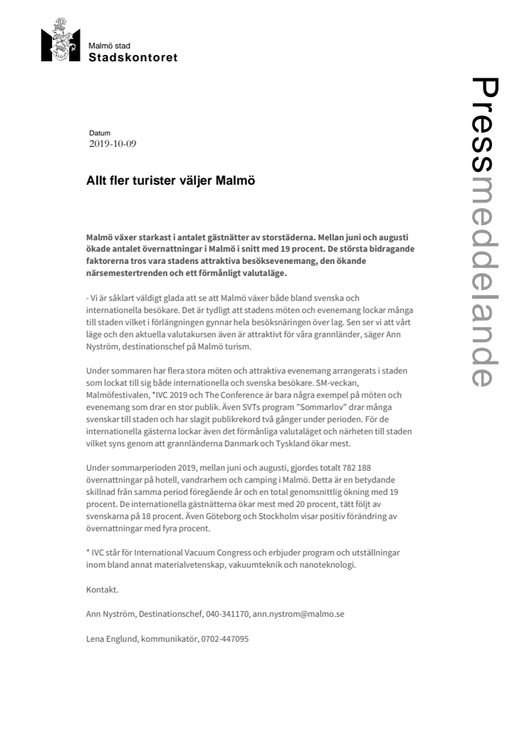 I sommar ökade antalet övernattningar i Malmö i snitt med 19 procent. Malmö växer starkast i antalet gästnätter av storstäderna. Attraktiva besöksevenemang, "hemestertrenden" och ett förmånligt valutaläge tros vara orsaker.