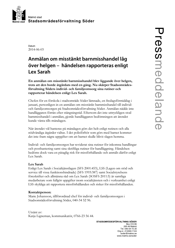 Stadsområdesförvaltning Söder skärper sina rutiner sedan en anmälan om en misstänkt barnmisshandel blev liggande över en helg. Händelsen rapporteras nu enligt Lex Sarah.