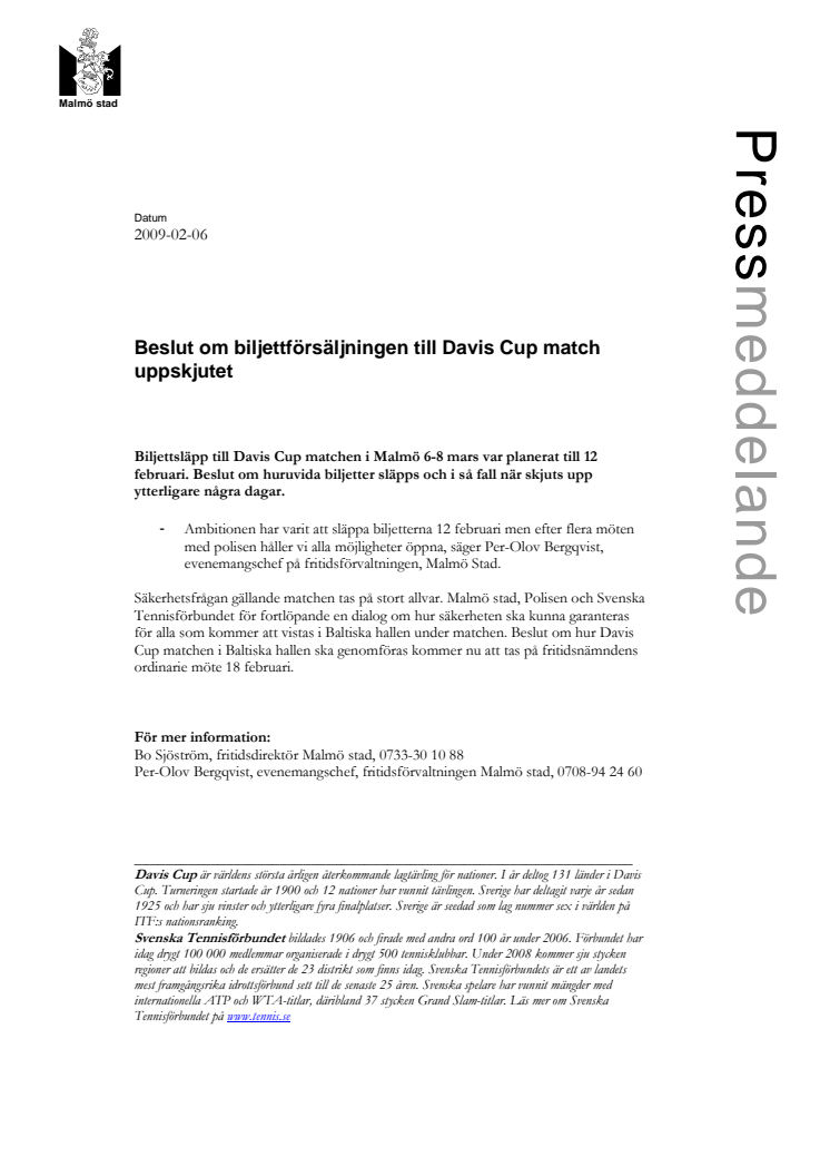 Biljettsläpp till Davis Cup matchen i Malmö 6-8 mars var planerat till 12 februari. Beslut om huruvida biljetter släpps och i så fall när skjuts upp ytterligare några dagar.