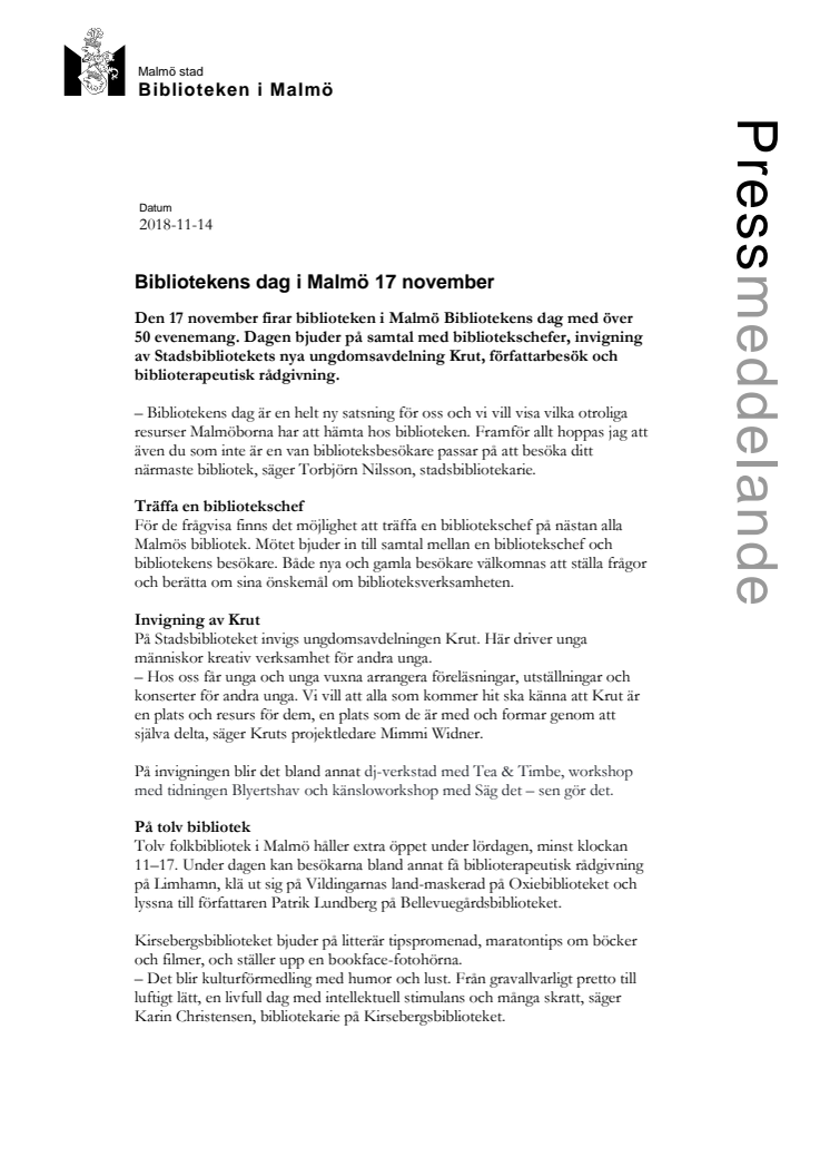 Den 17 november firar biblioteken i Malmö Bibliotekens dag med över 50 evenemang. Dagen bjuder på samtal med bibliotekschefer, invigning av Stadsbibliotekets nya ungdomsavdelning Krut, författarbesök och biblioterapeutisk rådgivning.