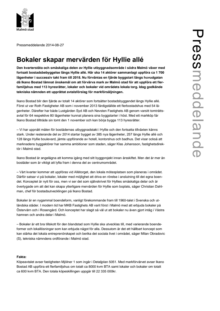 Den småskaliga delen av Hyllie utbyggnadsområde i södra Malmö växer med fortsatt bostadsbebyggelse längs Hyllie allé. Här ska 14 aktörer uppföra ca 1 700 lägenheter fram till 2018. Nu förväntas en fjärde byggstart längs huvudgatan då Ikano Bostad förvärvar mark av Malmö stad för att uppföra 113 hyresrätter, lokaler och bokaler. Idag godkände tekniska nämnden ett avtal för markförsäljningen.