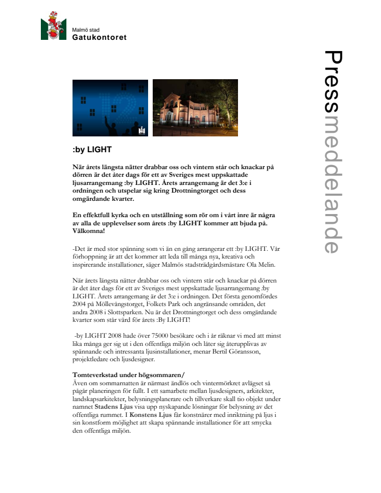 När årets längsta nätter drabbar oss och vintern står och knackar på dörren är det åter dags för ett av Sveriges mest uppskattade ljusarrangemang :byLight. Årets arrangemang är det 3:e i ordningen och utspelar sig kring Drottningtorget och dess omgärdande kvarter.
