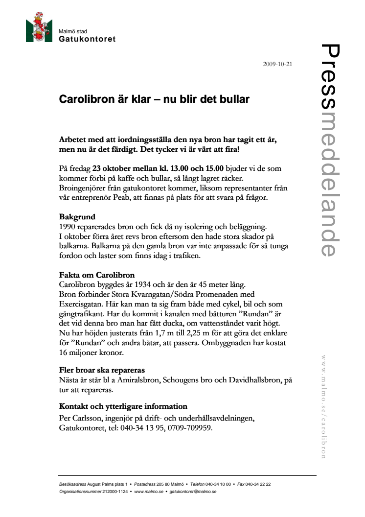 Arbetet med att iordningsställa den nya bron har tagit ett år, men nu är det färdigt. Det tycker vi är värt att fira! På fredag 23 oktober mellan kl. 13.00 och 15.00 bjuder vi de som kommer förbi på kaffe och bullar, så långt lagret räcker. Broingenjörer från gatukontoret kommer, liksom representanter från vår entreprenör Peab, att finnas på plats för att svara på frågor.