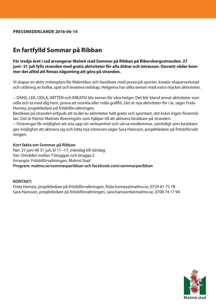 För tredje året i rad arrangerar Malmö stad Sommar på Ribban på Ribersborgsstranden. 27 juni−31 juli fylls stranden med gratis aktiviteter för alla åldrar och intressen. Oavsett väder kommer det alltid att finnas någonting att göra på stranden.