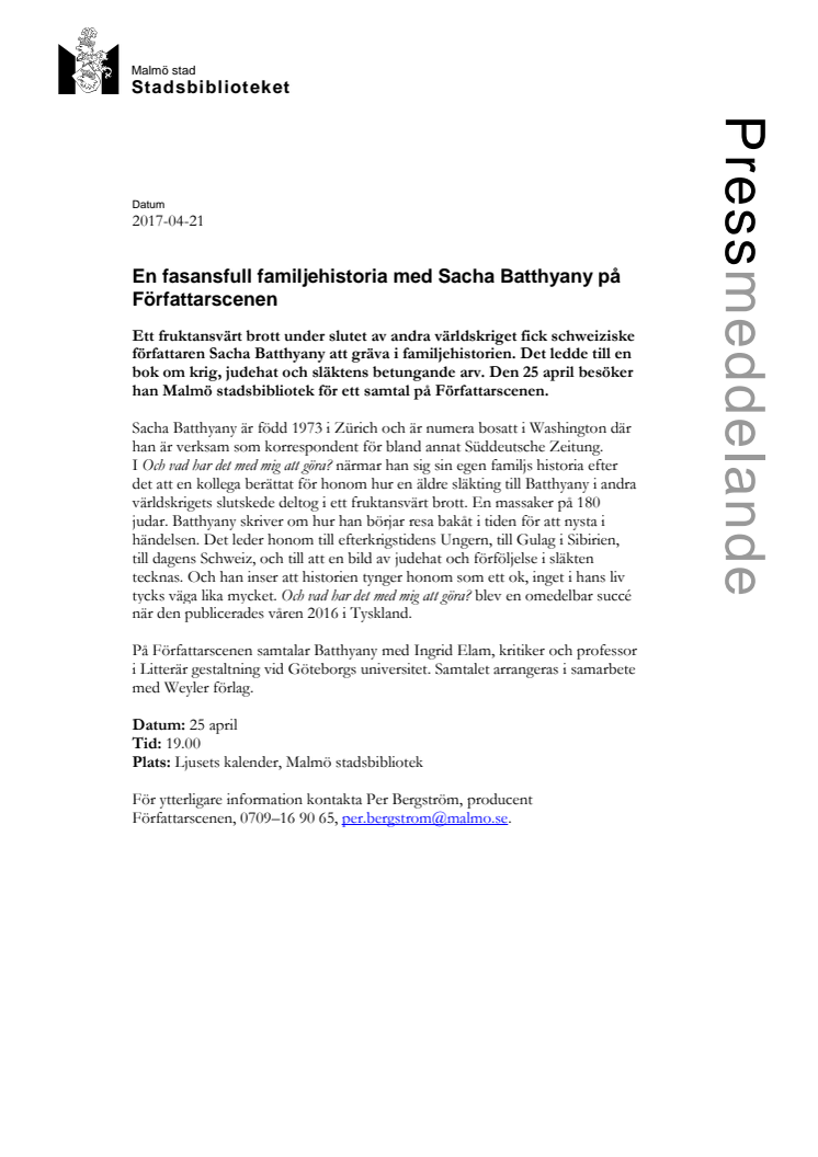 Den 25 april besöker den schweiziske författaren Sacha Batthyany Malmö stadsbibliotek för ett samtal på Författarscenen. Han är aktuell med boken Och vad har det med mig att göra?, där han gräver i sin egen släkthistoria och finner judehat och förföljelse. På Författarscenen samtalar Batthyany med kritikern och professorn Ingrid Elam.