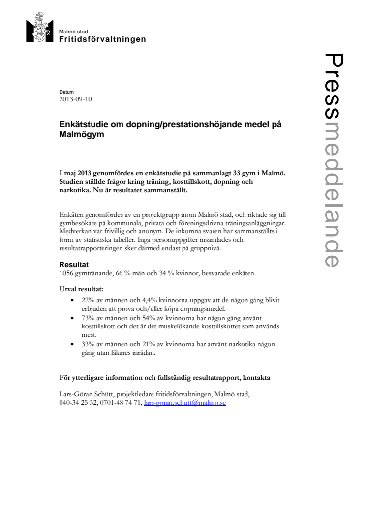 I maj 2013 genomfördes en enkätstudie på sammanlagt 33 gym i Malmö. Studien genomfördes av en projektgrupp inom Malmö stad och ställde frågor kring träning, kosttillskott, dopning och narkotika. Nu är resultatet sammanställt.