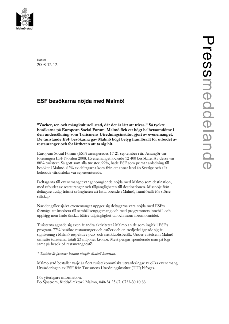 ”Vacker, ren och mångkulturell stad, där det är lätt att trivas.” Så tyckte besökarna på European Social Forum. Malmö fick ett högt helhetsomdöme i den undersökning som Turismens Utredningsinstitut gjort av evenemanget. De turistande ESF besökarna gav Malmö högt betyg framförallt för utbudet av restauranger och för lättheten att ta sig hit.
