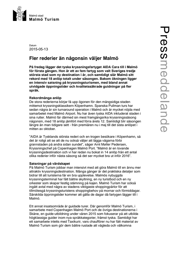 På fredag lägger det tyska kryssningsfartyget AIDA Cara till i Malmö för första gången. Hon är ett av fem fartyg som valt Sveriges tredje största stad som ny destination i år, och samtidigt slår Malmö sitt rekord med 18 anlöp totalt under säsongen.