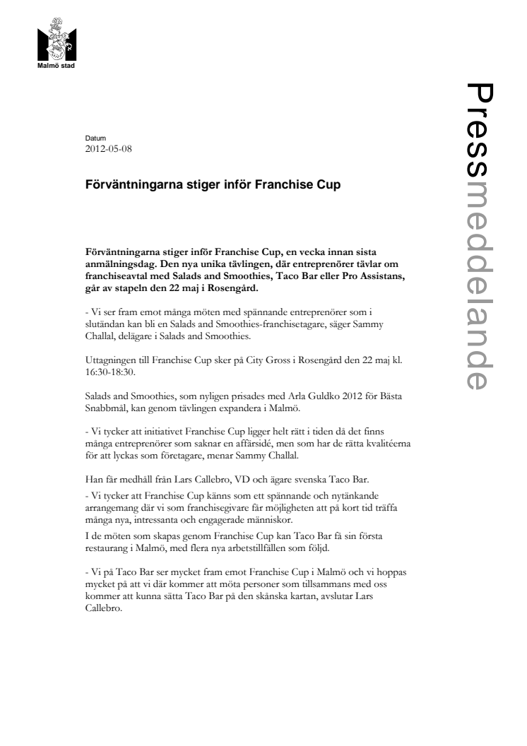 Förväntningarna stiger inför Franchise Cup, en vecka innan sista anmälningsdag. I den nya unika tävlingen tävlar entreprenörer om franchiseavtal med Salads and Smoothies, Taco Bar eller Pro Assistans, företag som antingen vill expandera eller etablera sig i Malmö. Tävlingen går av stapeln den 22 maj i Rosengård, och sista anmälningsdag är 15 maj.