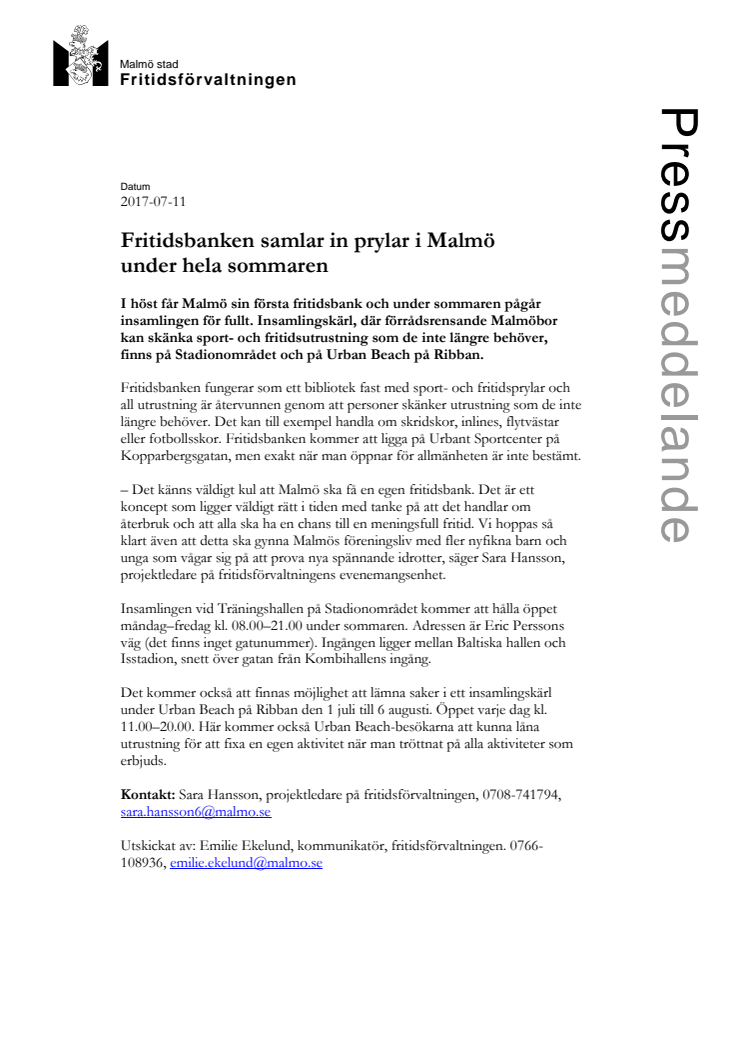 I höst får Malmö sin första fritidsbank och under sommaren pågår insamlingen för fullt. Insamlingskärl, där förrådsrensande Malmöbor kan skänka sport- och fritidsutrustning som de inte längre behöver, finns på Stadionområdet och på Urban Beach på Ribban.