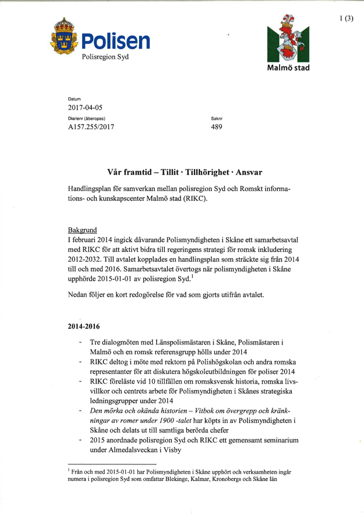 En handlingsplan för samverkan för mellan polisregion Syd och Romskt informations- och kunskapscenter Malmö stad (RIKC).