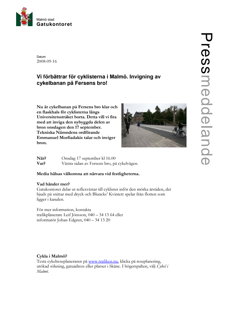 Vi förbättrar för cyklisterna i Malmö. Nu är cykelbanan på Fersens bro klar och en flaskhals för cyklisterna längs Universitetsstråket borta. Detta vill vi fira med att inviga den nybyggda delen av bron onsdagen den 17 september. Tekniska Nämndens ordförande Emmanuel Morfiadakis talar och inviger bron.