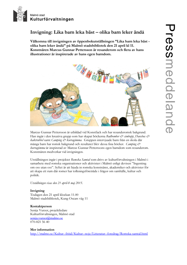 Välkomna till invigningen av öppenbokutställningen ”Lika barn leka bäst - olika barn leker ändå” på Malmö stadsbibliotek den 21 april kl 11. Konstnären Marcus Gunnar Pettersson är resanderom och flera av hans illustrationer är inspirerade av hans egen barndom.