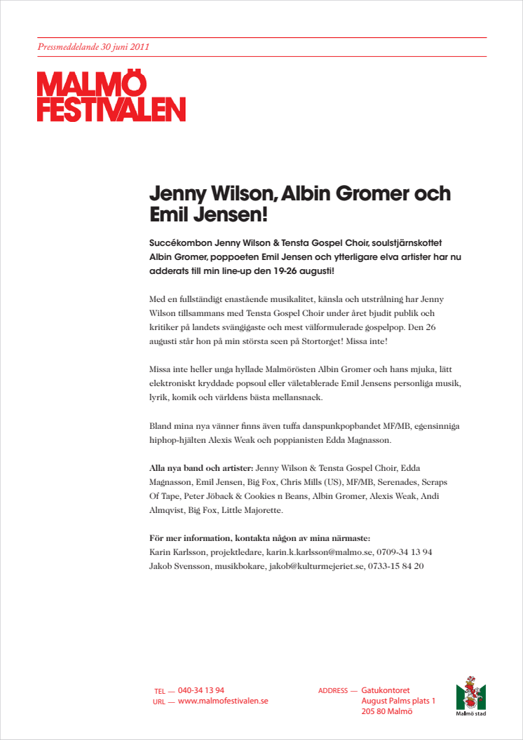 Jenny Wilson, Albin Gromer, Emil Jensen till Malmöfestivalen